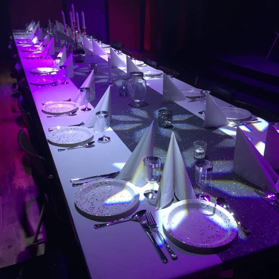 …Men det blev så mycket mer än så. Hösten 2015 när utsidan var renoverad och hela stora salen i princip klar såg vi på riktigt vad vi hade skapat. Vi hade skapat en efterfrågad lokal med så mycket mer möjligheter än vad vi trott. Fler och fler ringde och ville boka ”Teater Buratino”. Alla som kom hit satte sin touch på stället och gjorde kvällen till sin. Vi insåg ganska snabbt att vi måste underlätta för våra hyresgäster, så vi använde oss av vårt avancerade digitala mixerbord och skickade vidare ner signalen till en telekontakt i stora salen med bara ett volymreglage så att gästerna lätt kunde spela musik från telefon eller dator. Vi köpte in en Ipad så att ni som hyr kan styra allt ljus med enkelt förprogrammerat ljus som både har middagsbelysning, teaterbelysning, dansljus och konsertljus.